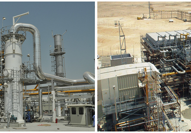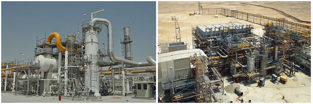 At this Compressor station-7, gas from several GOSP’s is gathered into an inlet header and compressed by two-stage centrifugal compressors driven by a gas turbine to about 420psig. The gas is then cooled by air fans to about 110oF. During this process some of the gas is condensed and sent to Central Gas Plant (CGP) as condensate. The compressed gas however contains some water vapour and acidic gases like carbon-di-oxide and hydrogen sulphide.